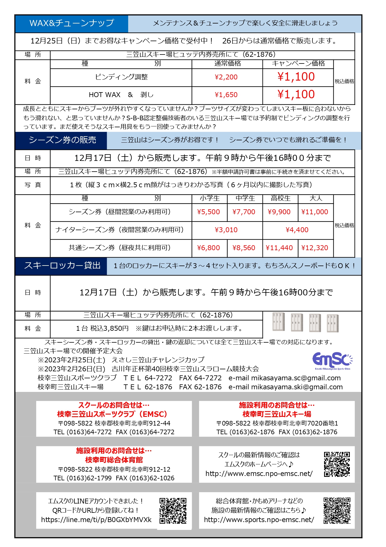 また、12月17日(土)からスキーロッカー貸出受付、各種シーズン券の販売を開始しております。