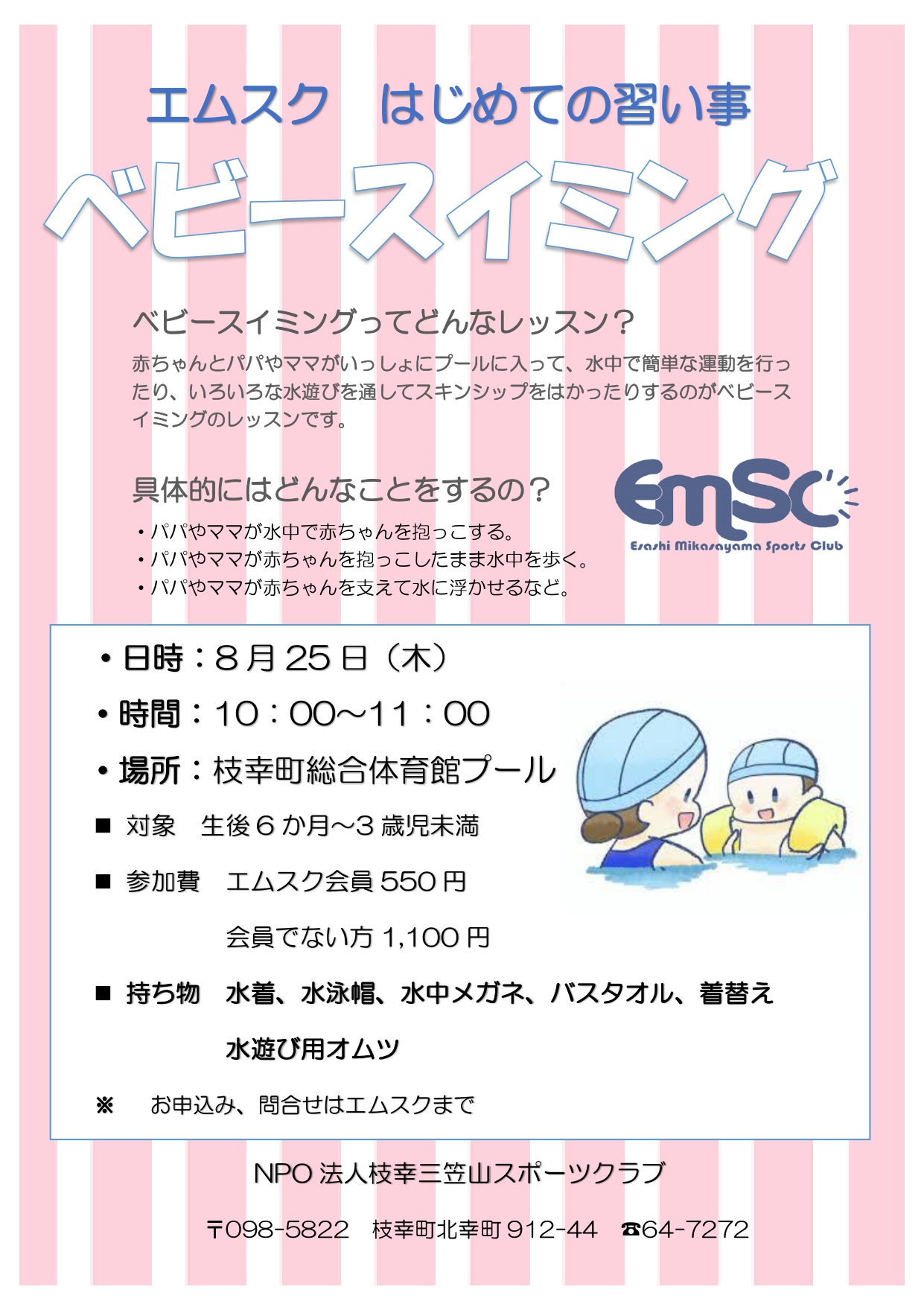 エムスクスクールでは、お子さんの初めての習い事として「ベビースイミング」を開催します。