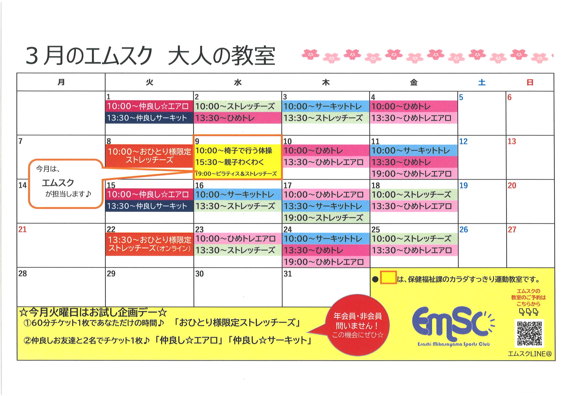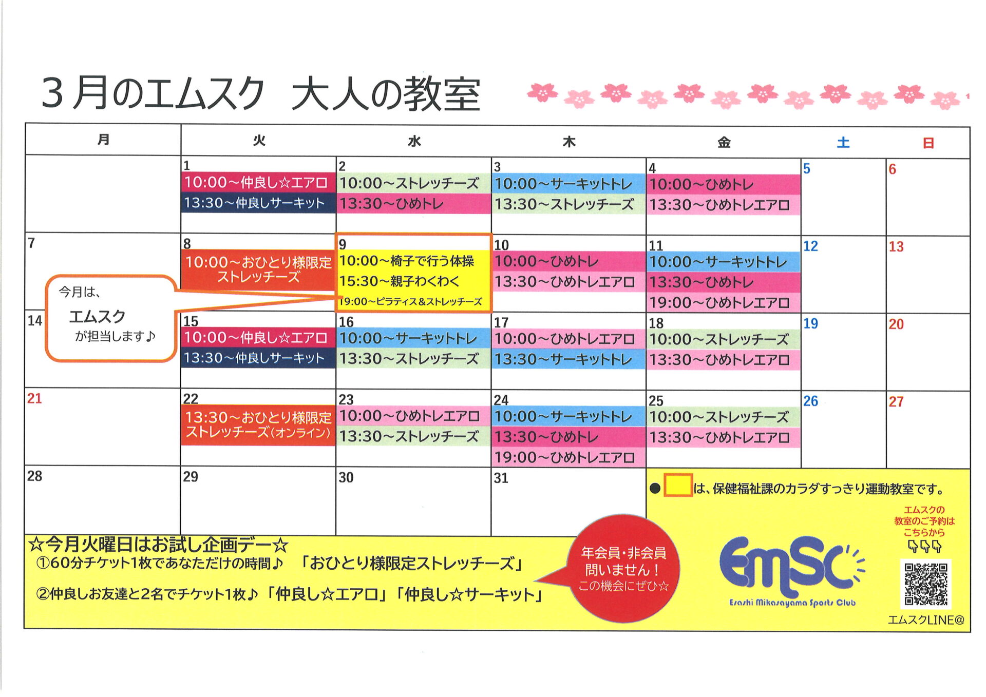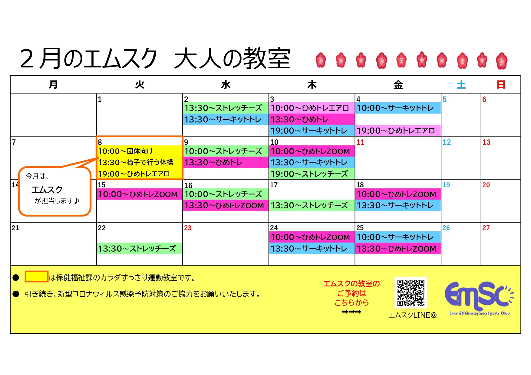エムスクスクールも引き続き感染対策のご協力をいただきながら開催いたしますので、ぜひ皆様の健康づくりにお役立てください。