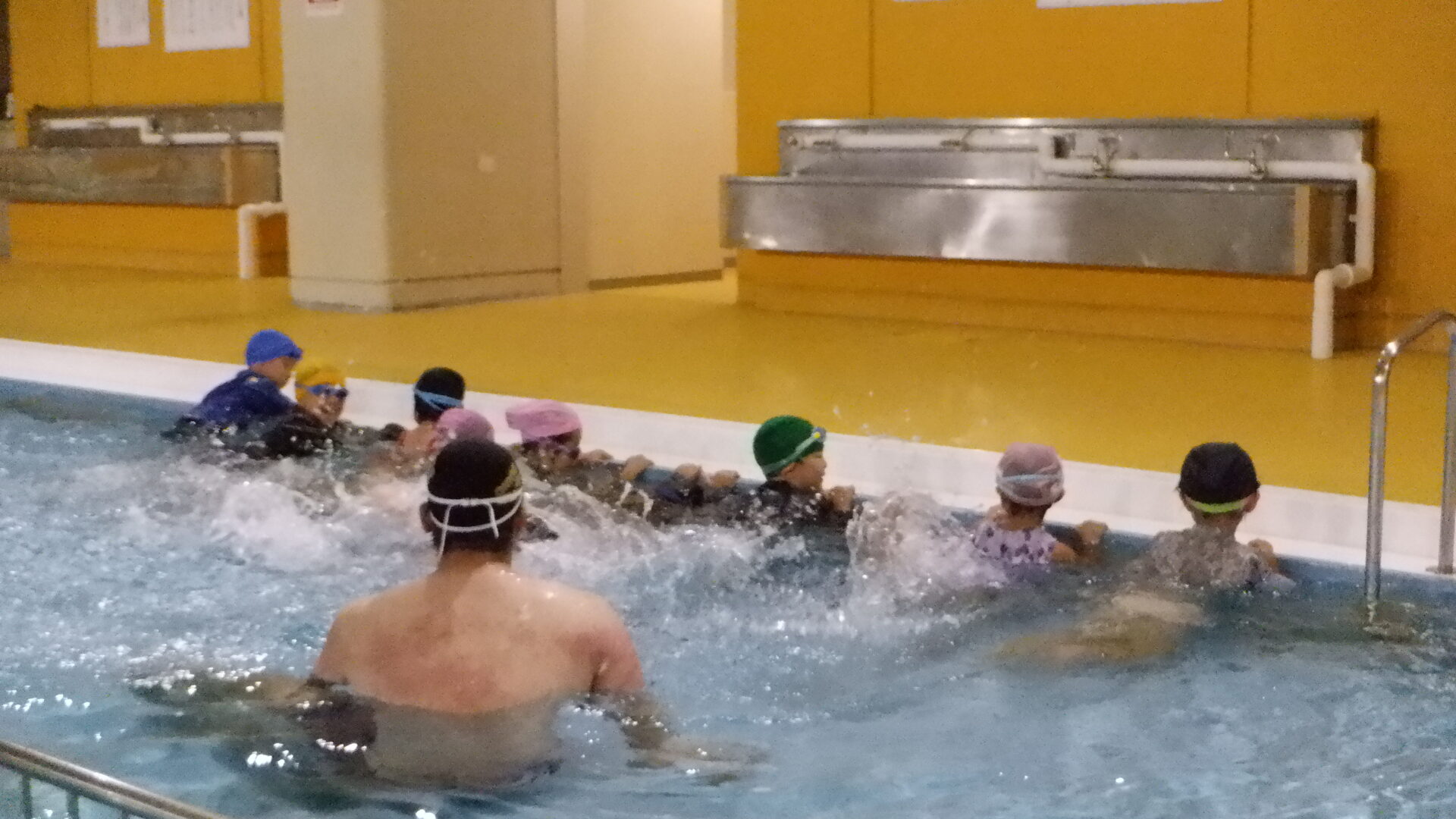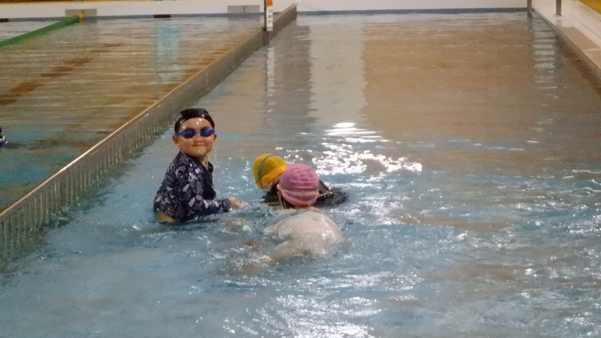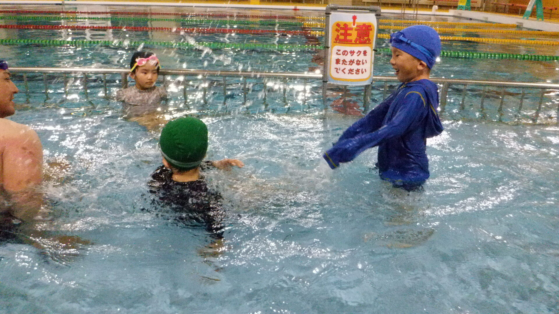 最初は水に慣れるため、水に顔をつけたり、潜ったり、足をバタバタしたりなど、、、
