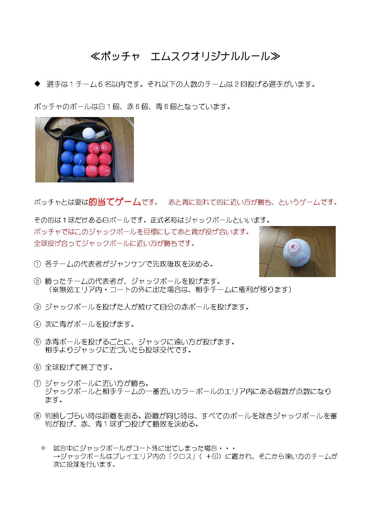ボッチャは白のボールに赤・青の6球ずつを投げ、白のボールに一番近いチームが勝ちとなるシンプルなルールのため、ボッチャ経験がなくても参加大歓迎!!