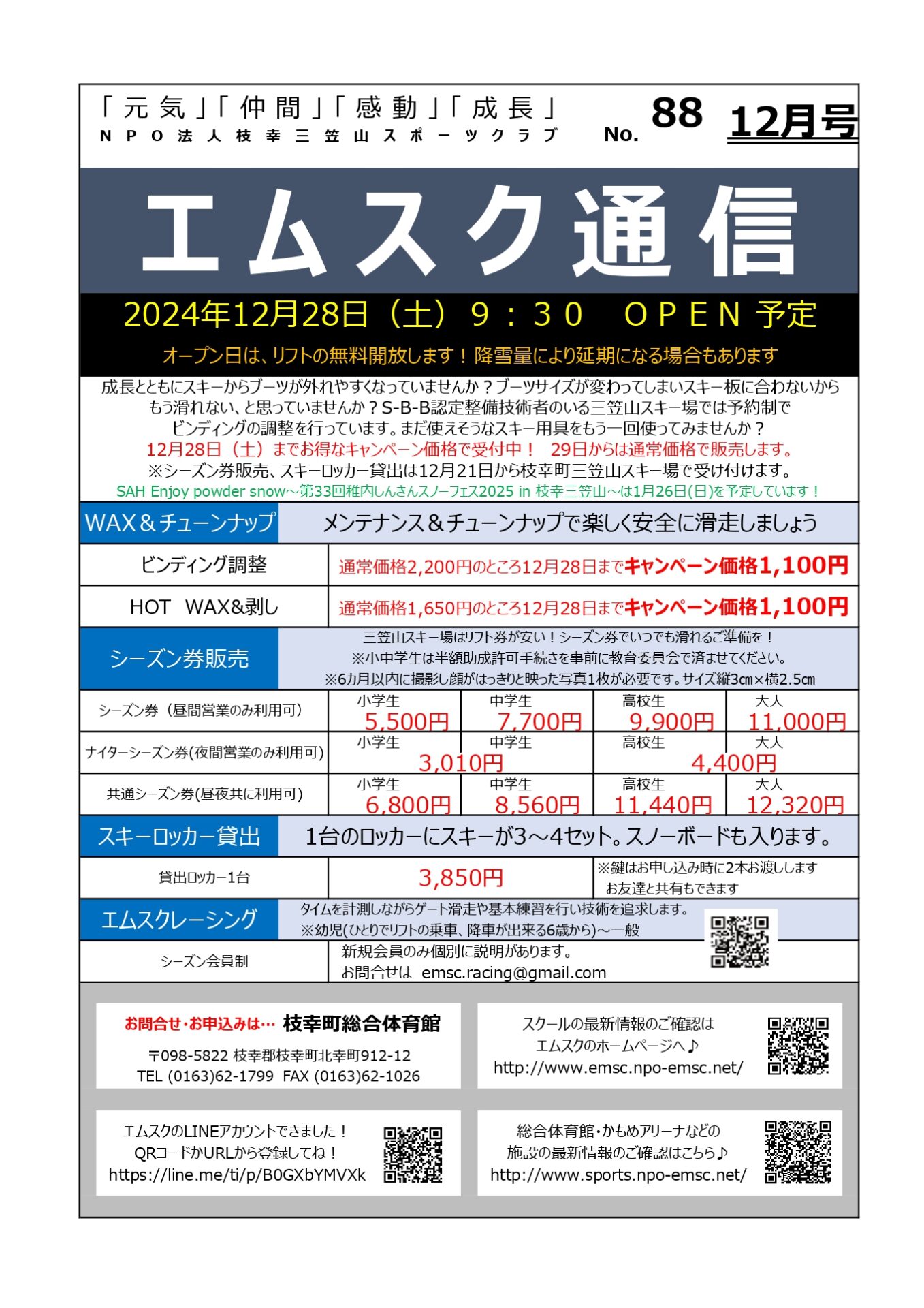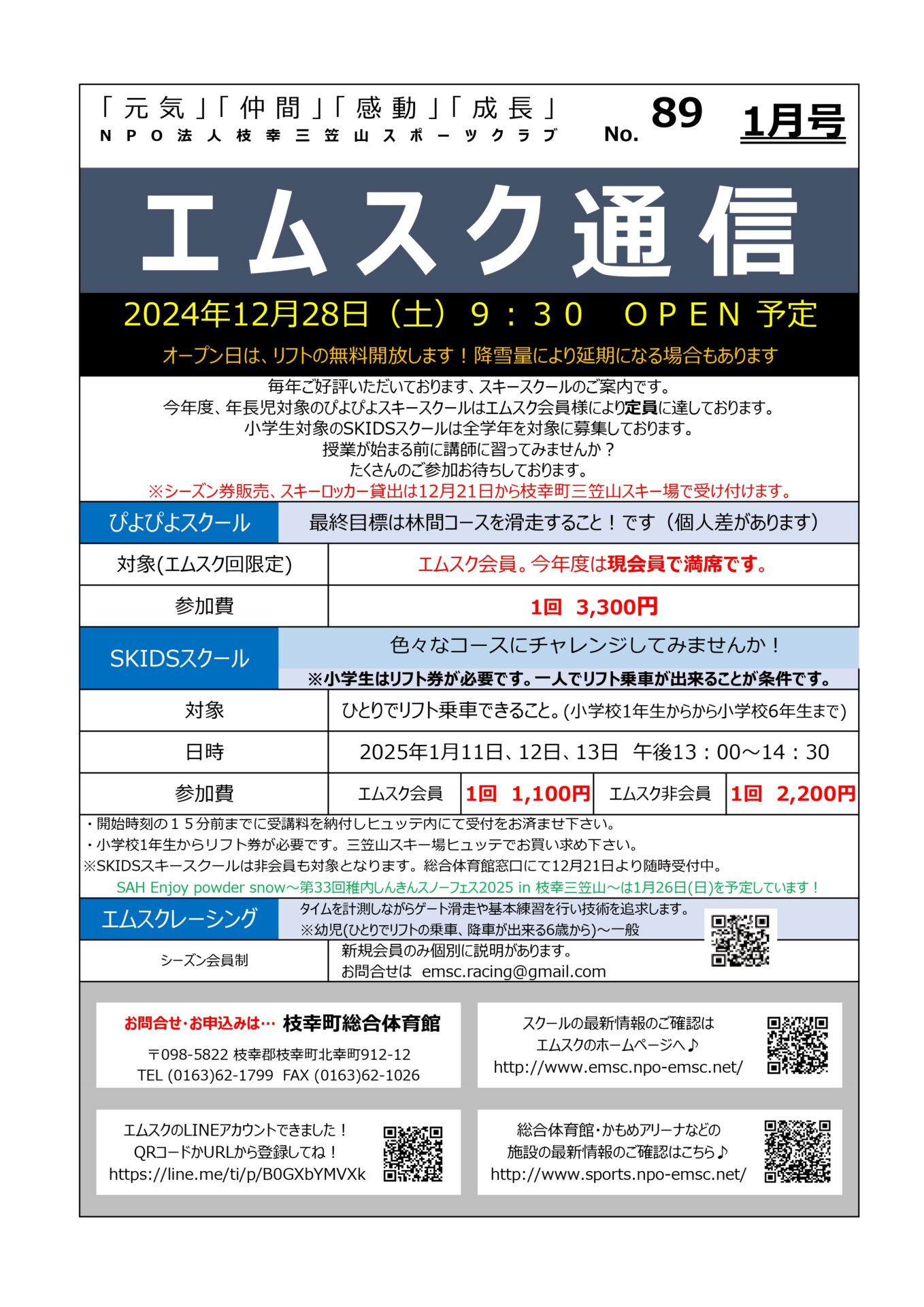 幼児対象のぴよぴよスキースクールの方はエムスク会員様先行案内で 定員に達しました。
