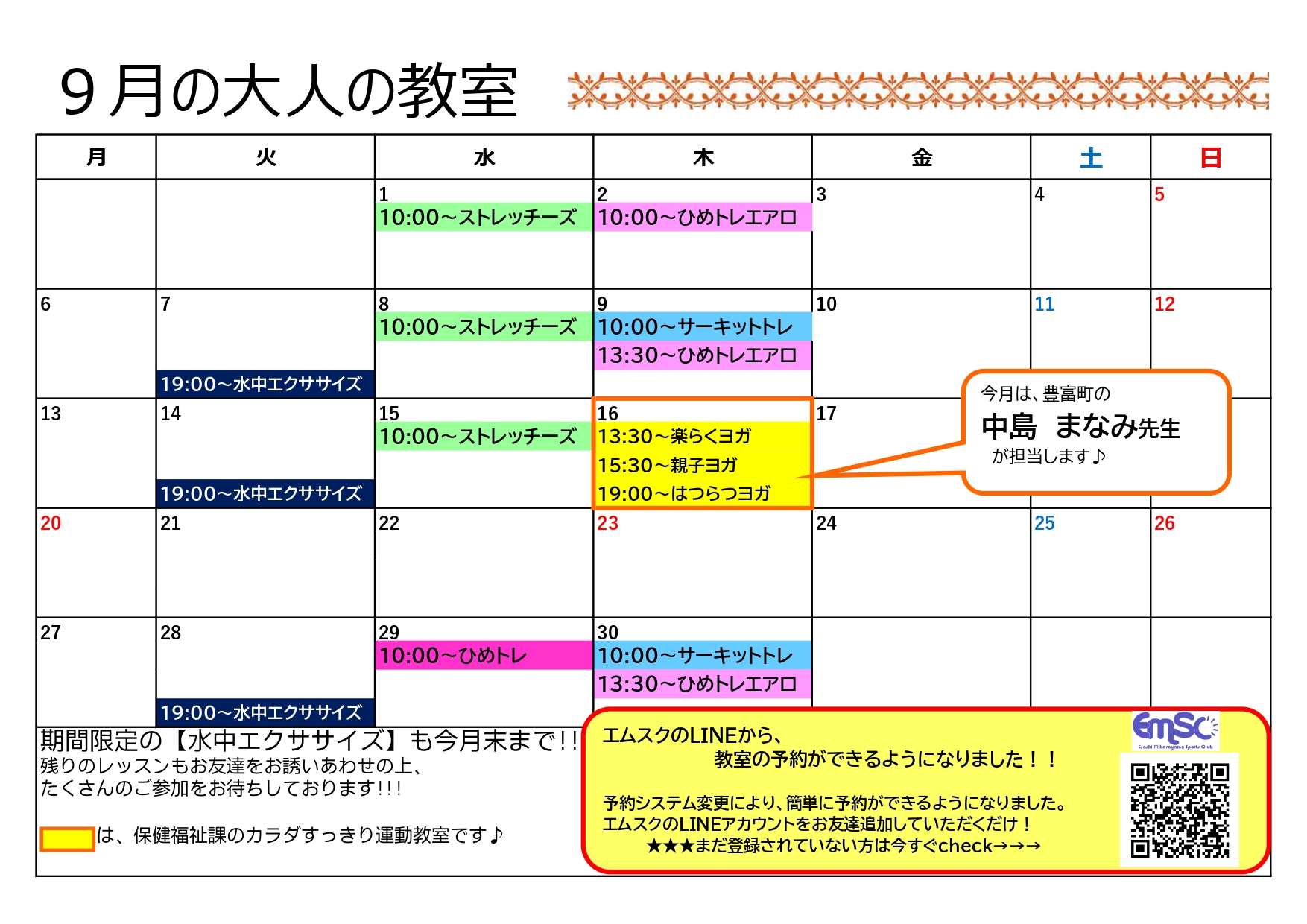 9月9日(木)10:00~の「サーキットトレーニング」について、都合により「ひめトレ&ソフトエアロ」へ変更となりますので、ご了承ください。