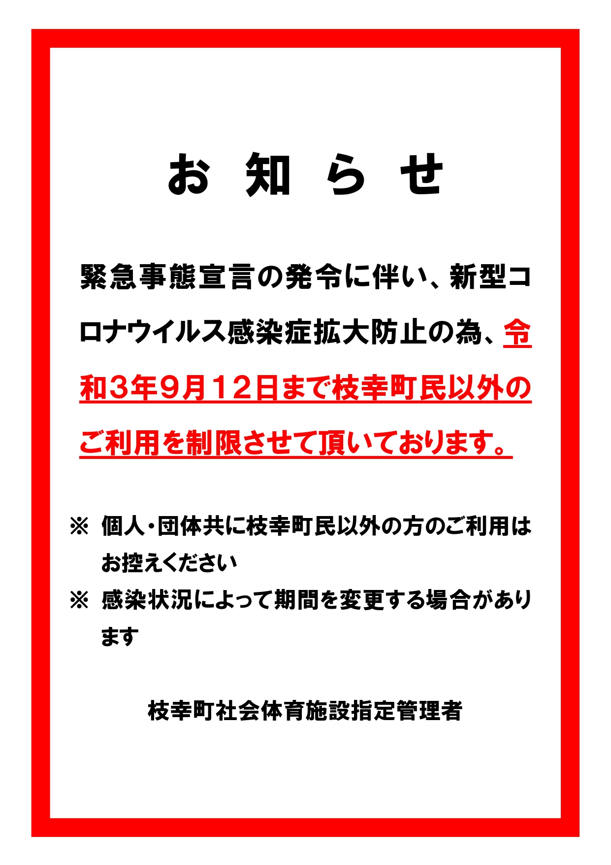 緊急事態宣言の発令に伴い、新型コロナウイルス感染症拡大防止の為、令和3年9月12日まで枝幸町民以外のご利用を制限させて頂いております。