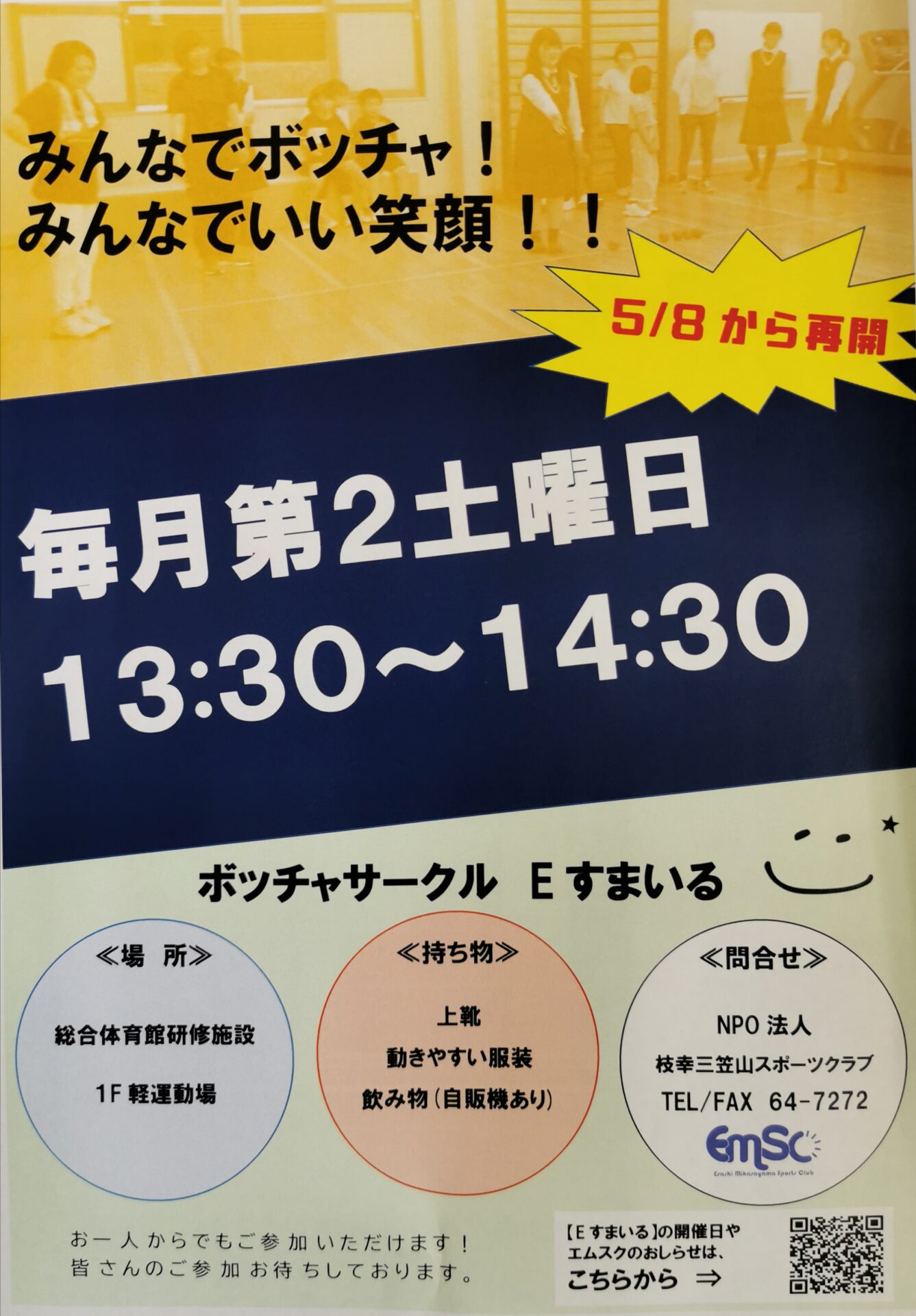 ボッチャサークル「Eすまいる」再開します! 5月 1, 2021 by 枝幸三笠山スポーツクラブ お知らせ スクール, その他 昨年度は新型コロナ感染拡大により、お休みしていた「Eすまいる」ですが、 今年度は感染対策を講じながら5月8日(土)13:30~研修施設(軽運動場)で開催します!! qrf 小さいお子さんからシニアの方まで、どなたでもご参加いただけます。 「ボッチャってどうやってやるの?」という初めての方でも簡単にできますよ♪ お一人でのご参加もOK!お友達やご家族でのご参加も大歓迎!! 地域や世代間交流の場として・・・ちょっとした運動のきっかけづくりに・・・ 「Eすまいる」にぜひご参加くださいね!