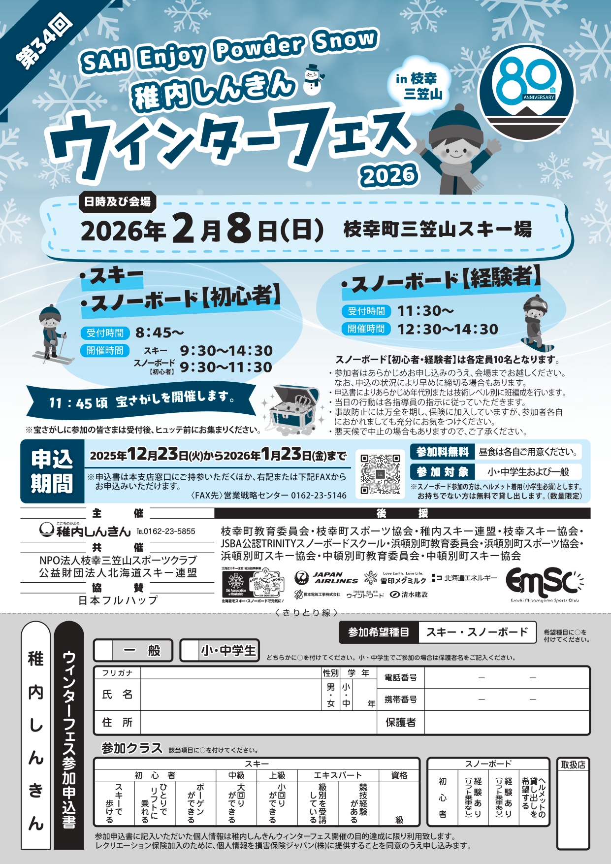 「第34回 SAH Enjoy powder snow 稚内しんきん in 枝幸三笠山 ウィンターフェス 2026」が開催されます。