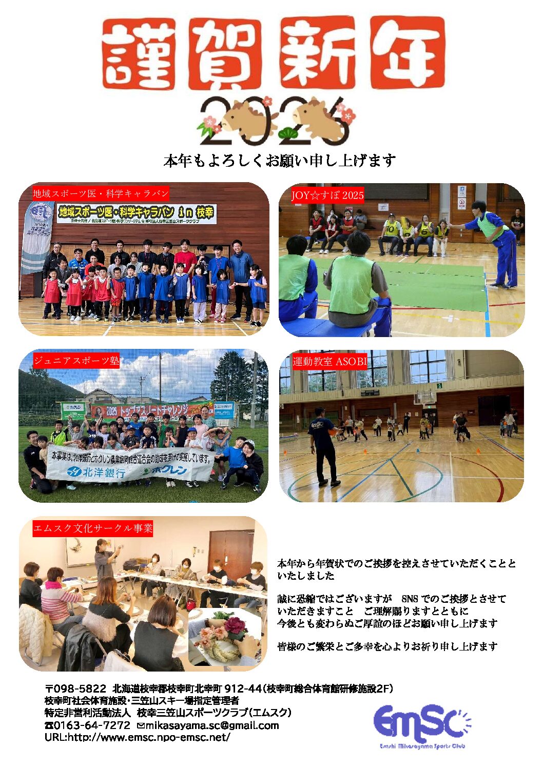 謹賀新年 ご挨拶 1月 6, 2026 by 枝幸三笠山スポーツクラブ お知らせ 新年明けましておめでとうございます。旧年中はエムスクをご愛顧いただき誠にありがとうございました。本年もよろしくお願いいたします。2026年が皆さまにとって明るく素敵な一年となりますように。2026年1月6日NPO法人枝幸三笠山スポーツクラブ