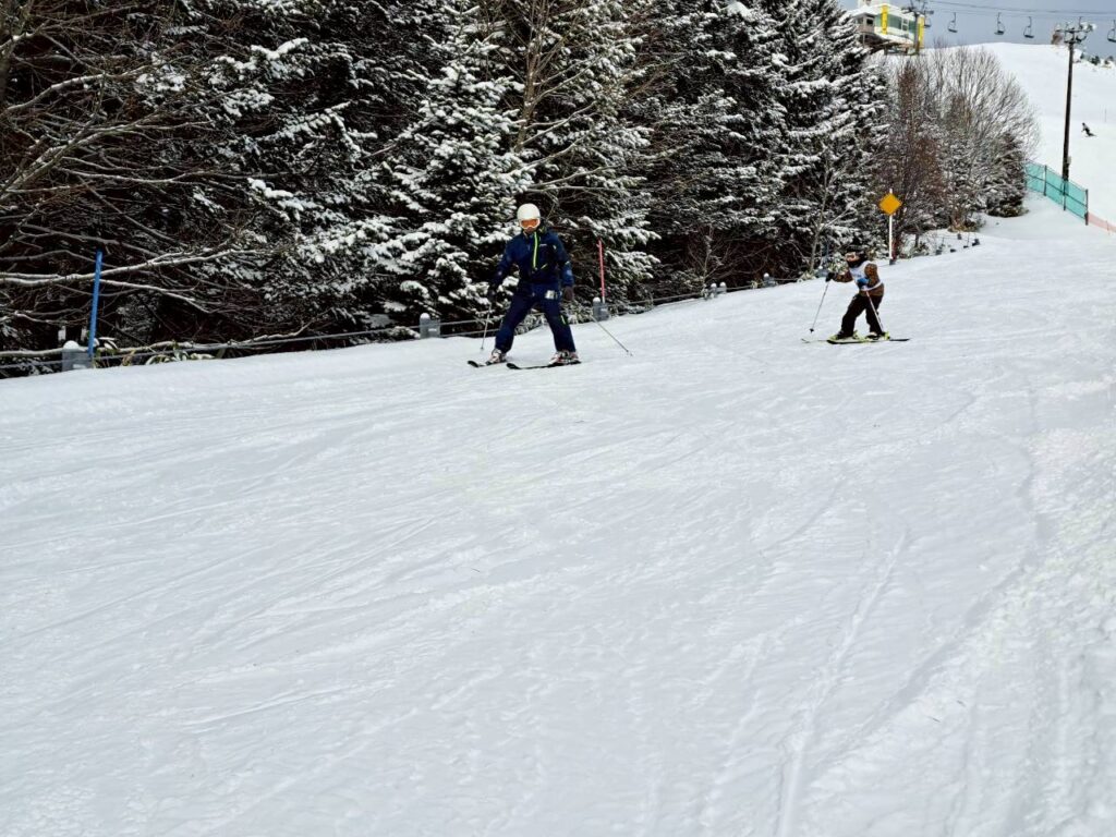 skidsスキースクールでは、4グループに分かれて、林間コース・初級コース・中級コースを八の字で滑りました。