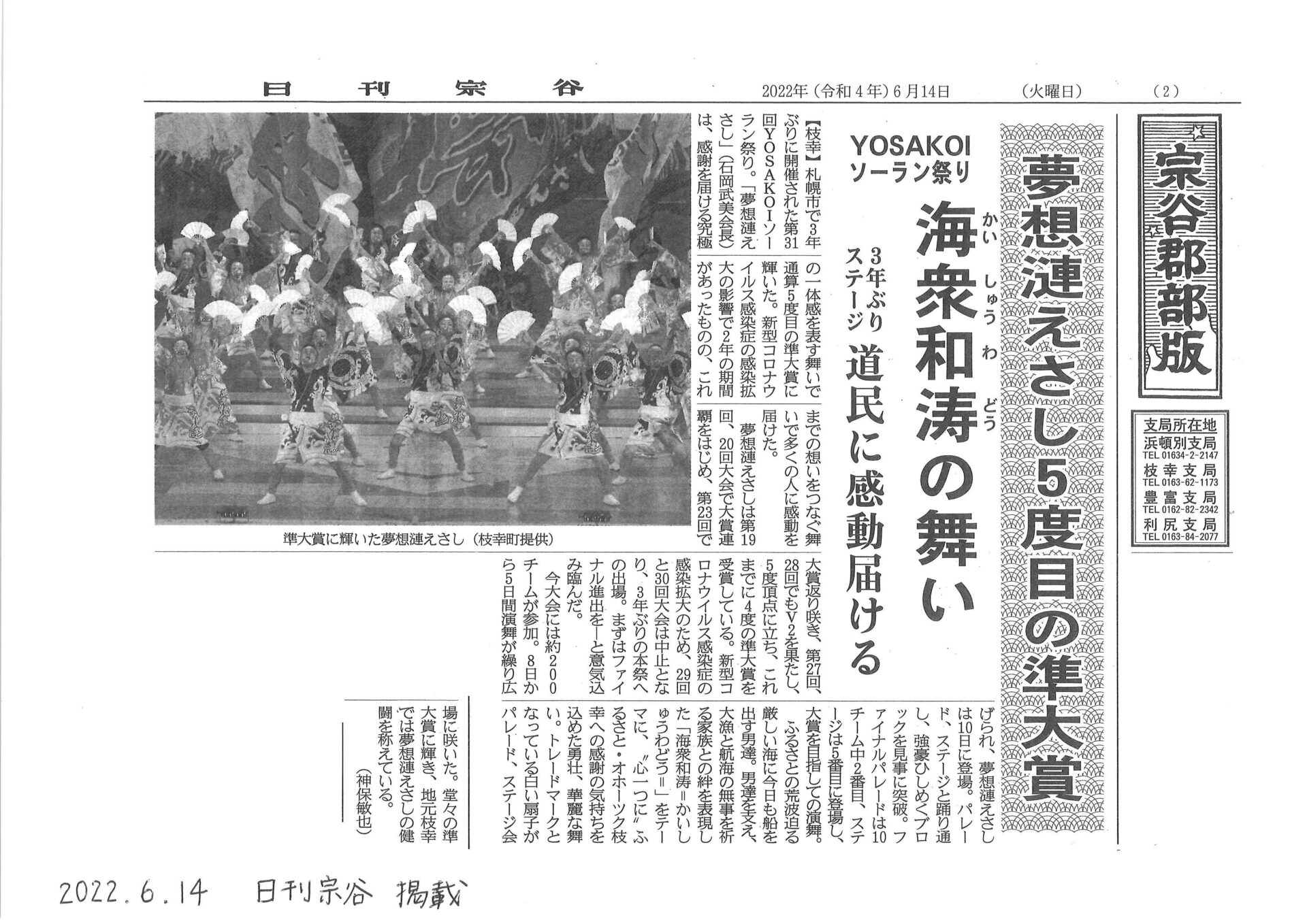 6月8~12日に札幌市で開催された「第31回YOSAKOIソーラン祭り」で、夢想漣えさしが準大賞を受賞されました!